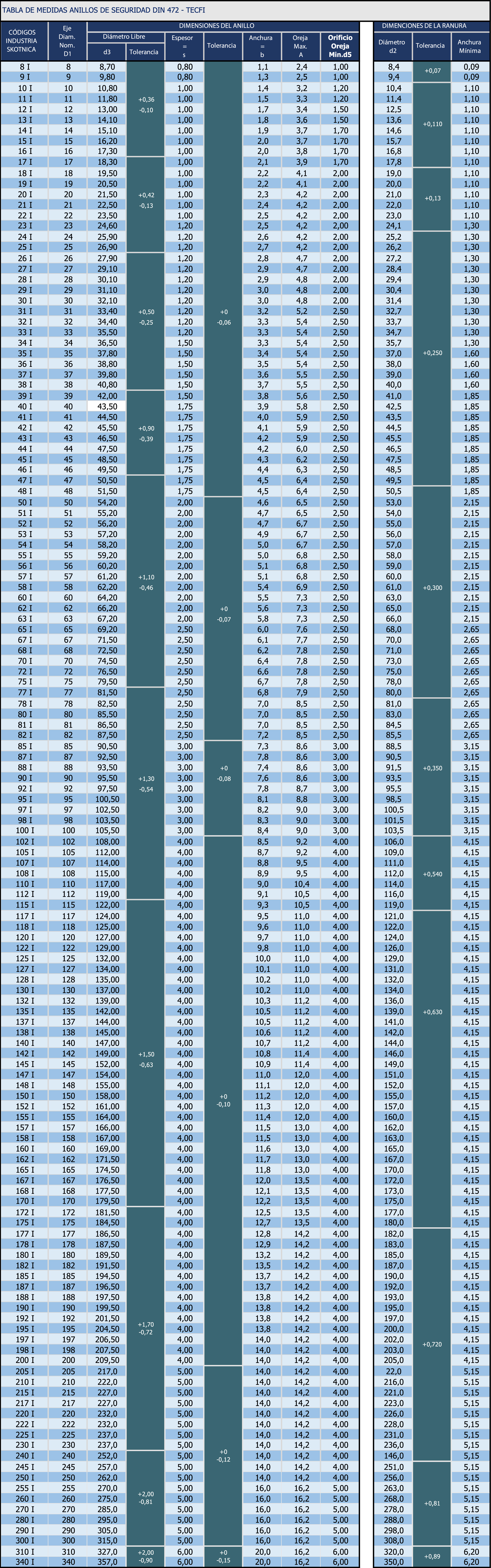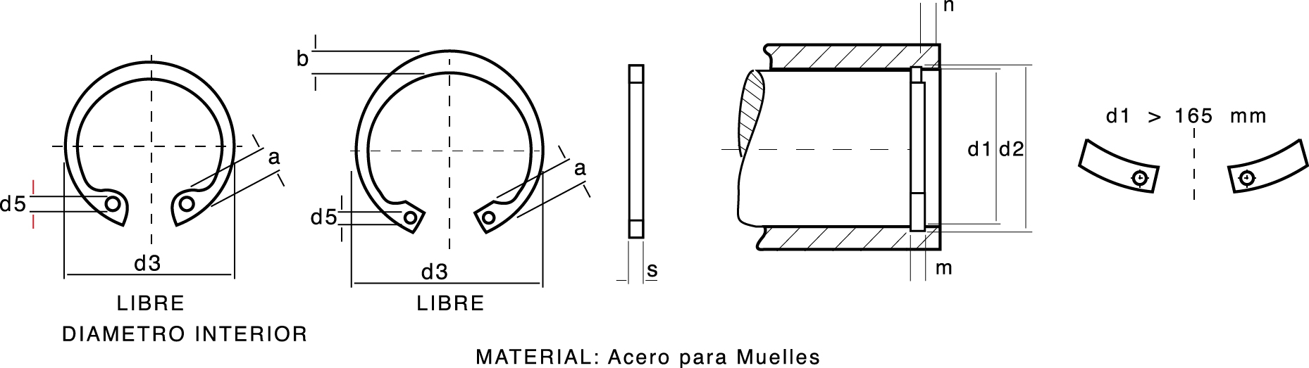tienen un Diámetro Exterior mayor al alojamiento, cuando éste es aplicado, la fuerza elática que ejerce el anillo hace que se fije a la ranura. Para su correcto uso consulte nuestras tablas.