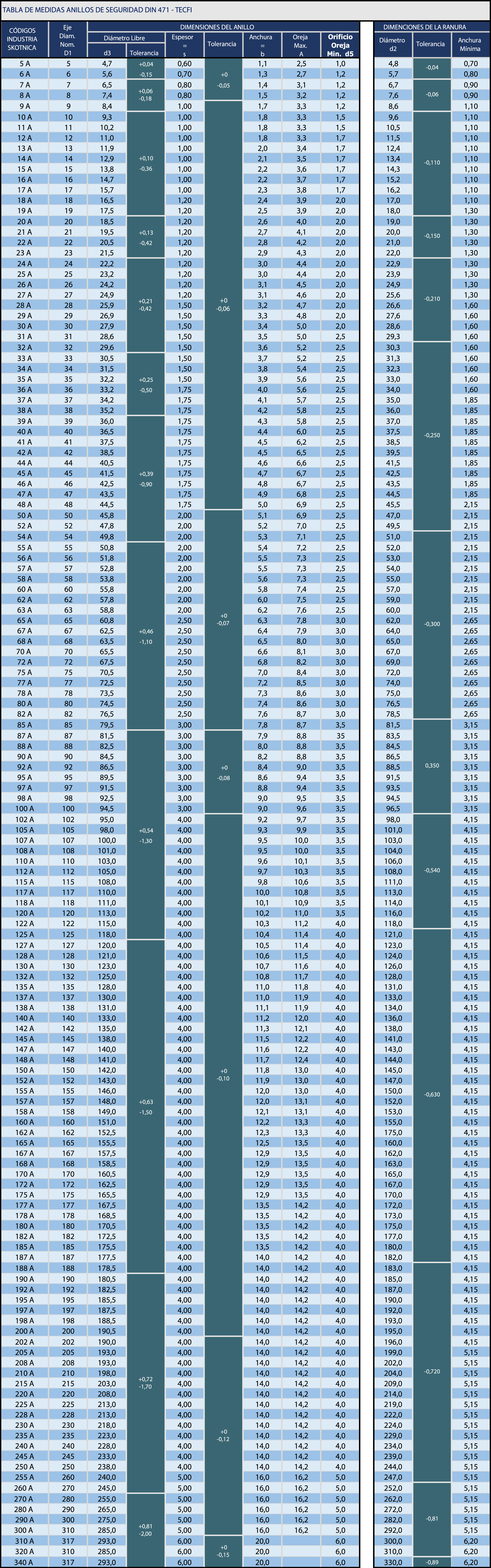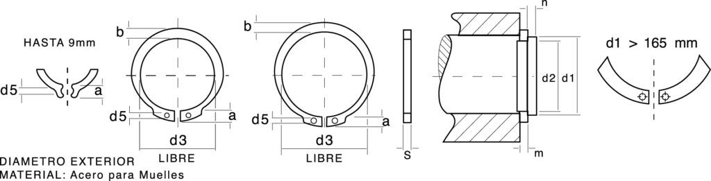 tienen un Diámetro Interior menor al alojamiento, cuando éste es aplicado, la fuerza elática que ejerce el anillo hace que se fije a la ranura. Para su correcto uso consulte nuestras tablas.