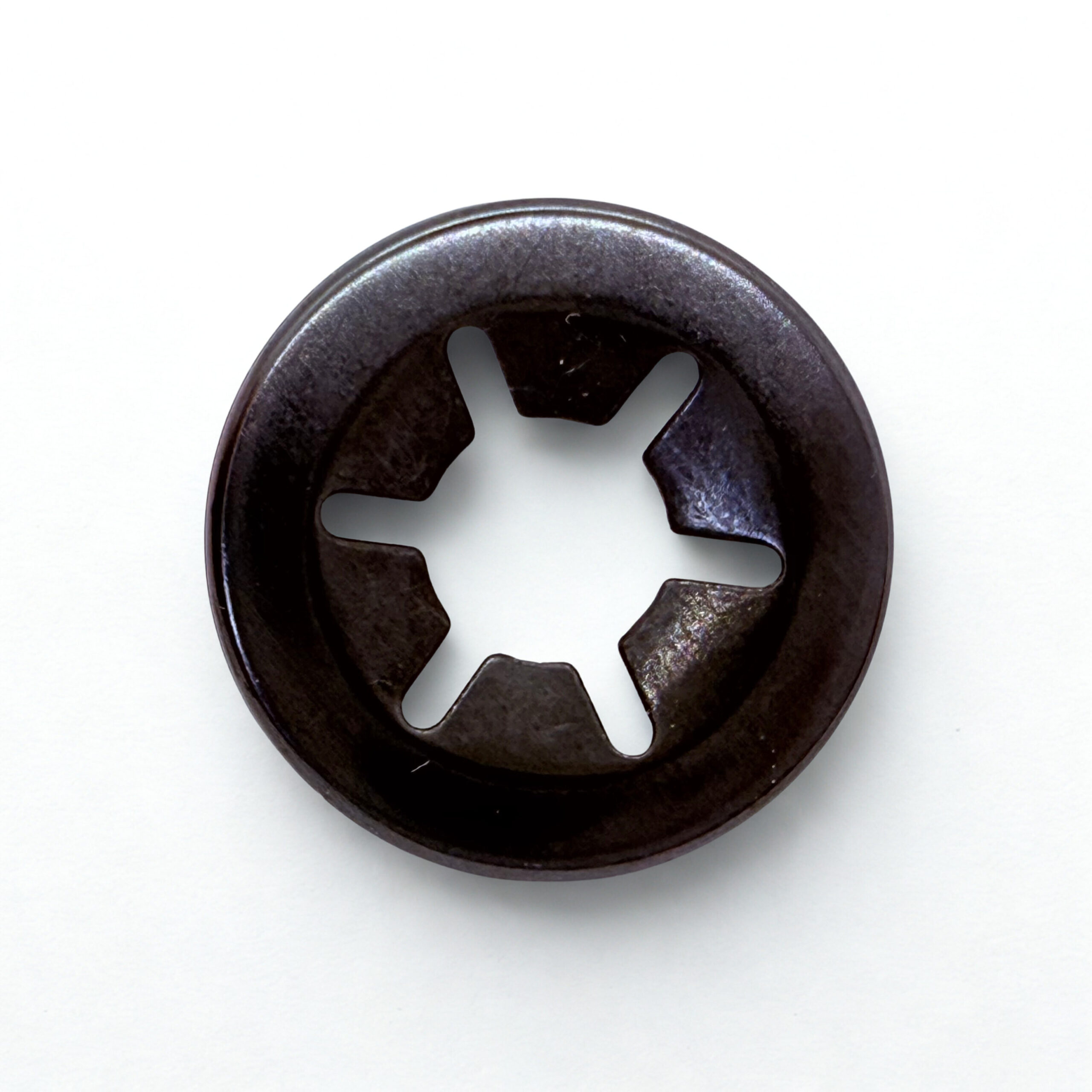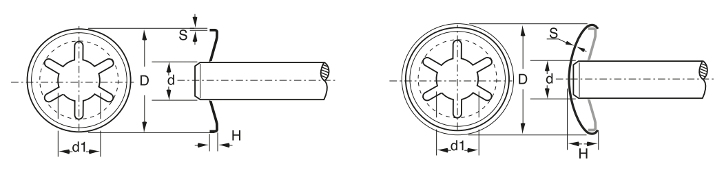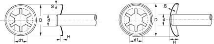 Dado que este tipo de arandelas dispone de una pestaña ligeramente inclinada, que permite la colocación muy fácil en el sentido de la flecha, es prácticamente imposible de extraer (sólo con rotura de la arandela) por el extremo, ya que las pestañas quedan fuertemente agarradas al eje.
