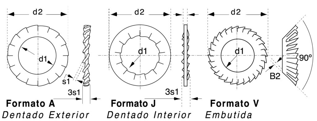 , éstas son del tipo «A» , tipo «J» y tipo «V» ; la primera dispone de más secciones de agarre ya que tienen el dentado exterior, por el contrario el tipo «J» se refiere cuando no se desea que los cortes de la arandela sean visibles ya que éstos quedan en la parte interior de la arandela, la «V» de fijación y presión de ajuste.