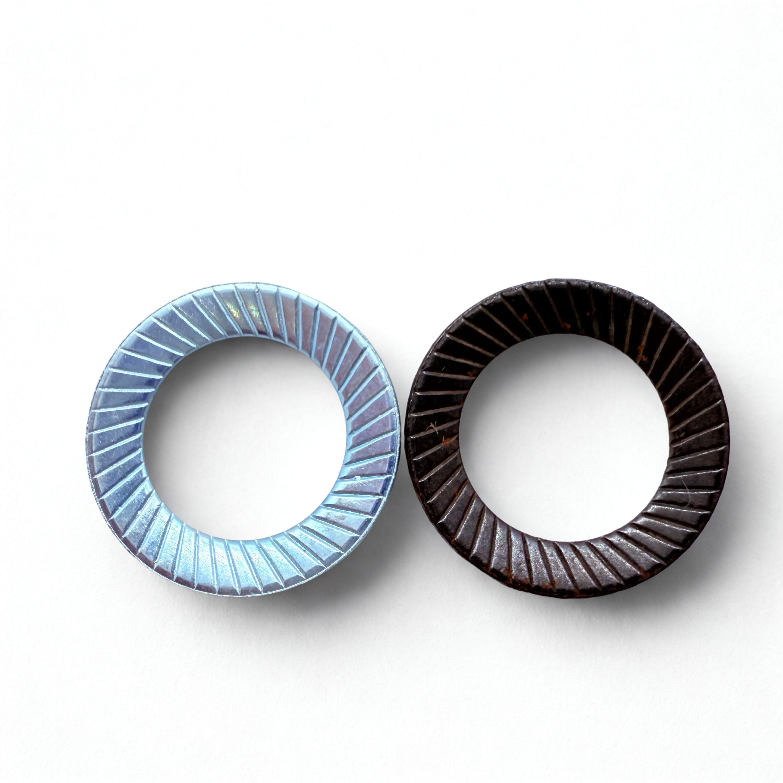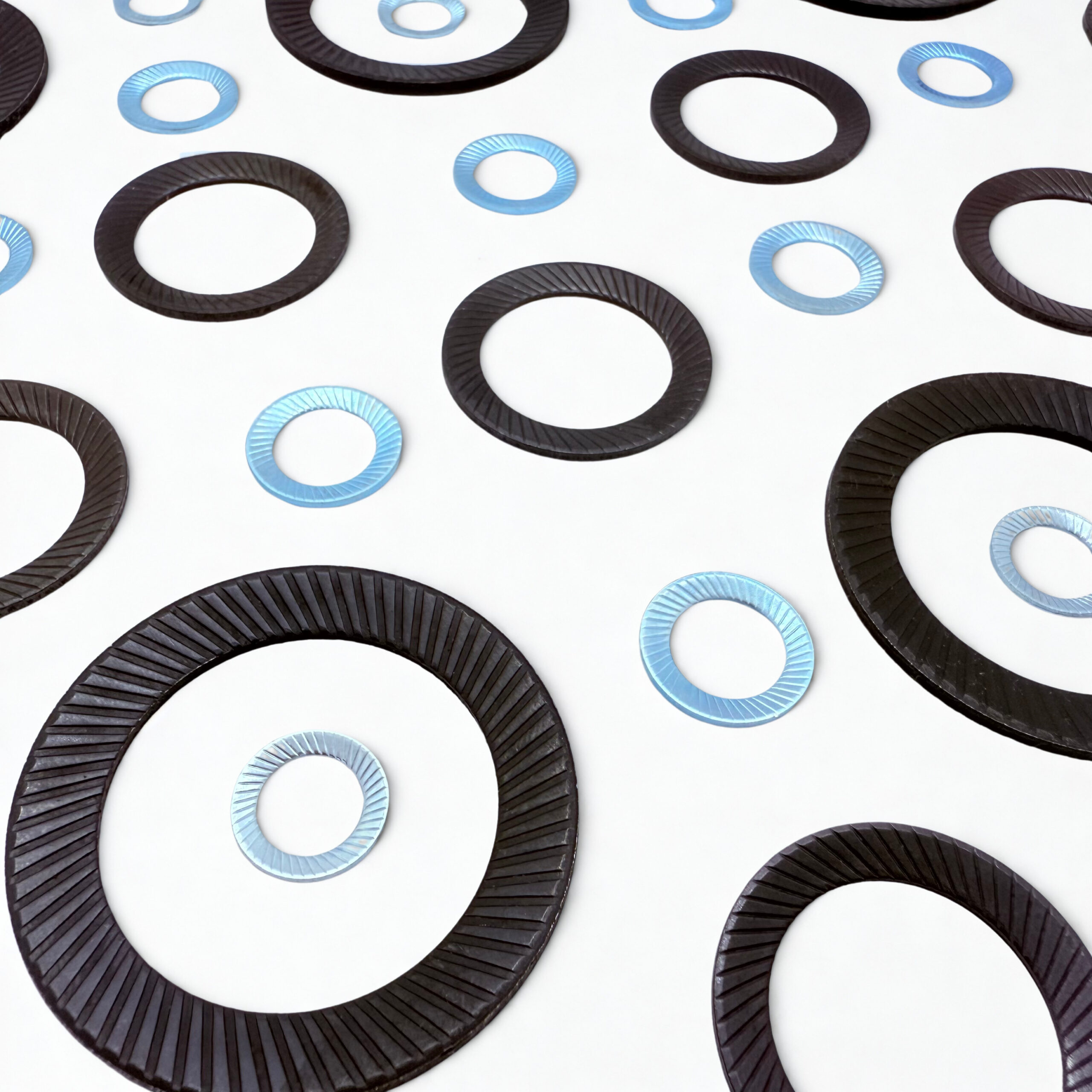 , se utilizan para fijaciones seguras y para contrarrestar las vibraciones. Tienen forma de resorte de disco y cuentan con estrías en ambos lados.