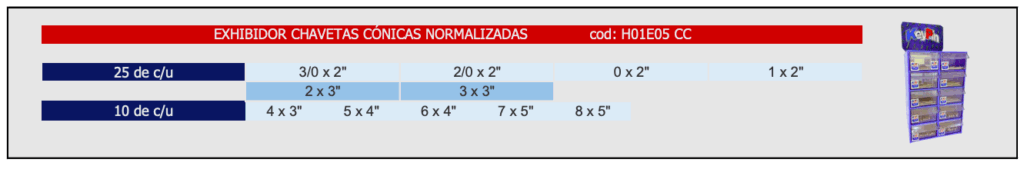 se las denomina por el número del calisuar utilizado más el largo correspondiente. Ejemplo: Chavetas Cónica