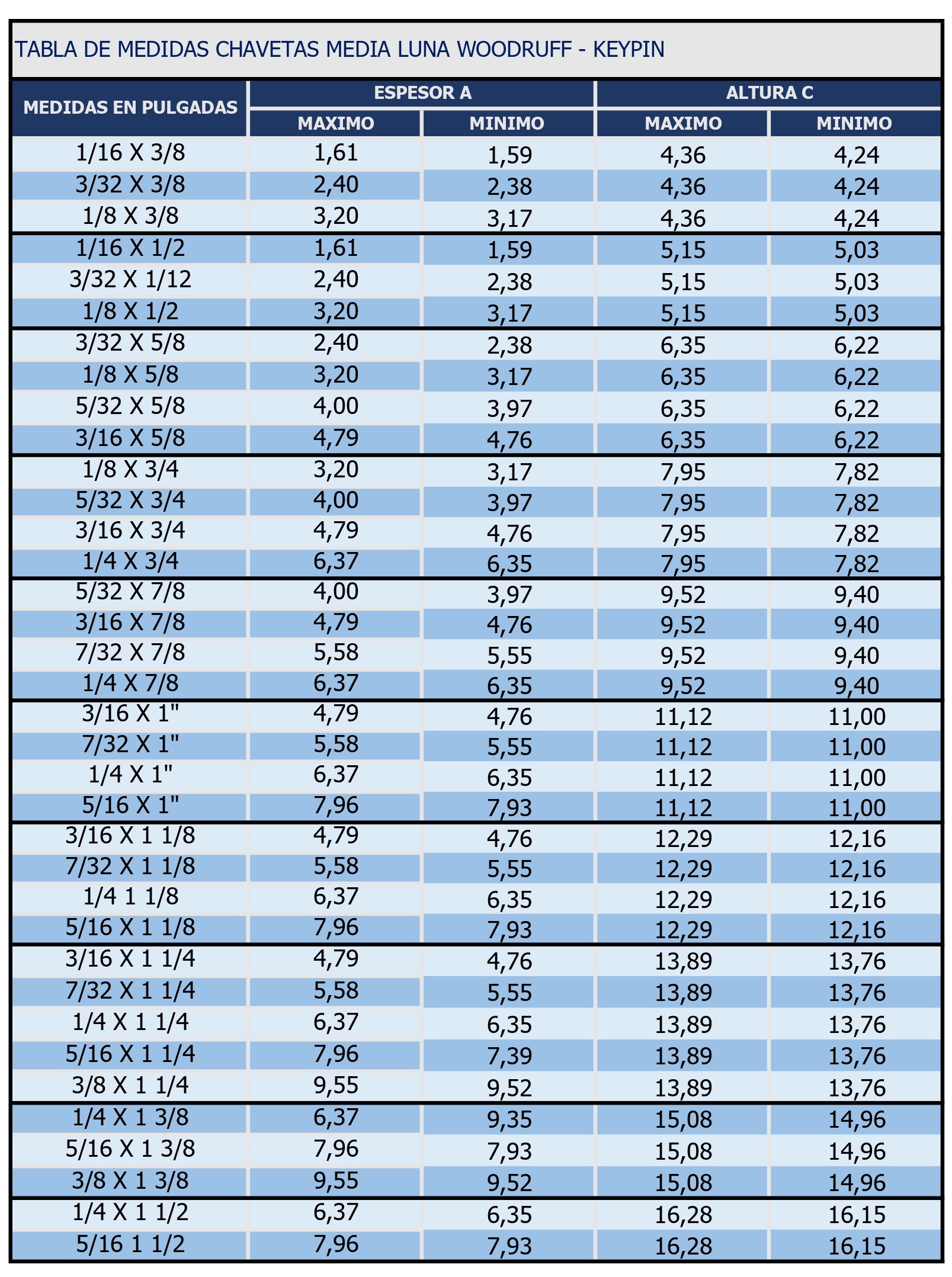 Las Chavetas Media Luna  standard son fabricadas controlando cuidadosamante las medidas y  respetando las tolerancias indicadas en la norma DIN 6888, WOODRUF o Planos de fabricación especial. Esto es sumamente importante para evitar el desgaste prematuro de los dispositivos o equipos mecánicos.