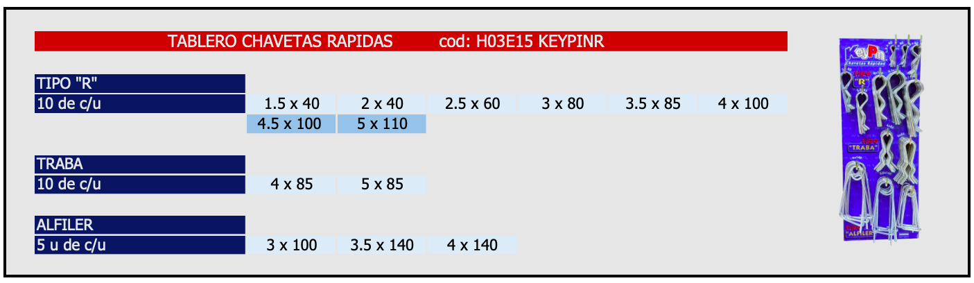 En este grupo tenemos como línea Standard las CHAVETAS «R» también llamadas orugas, CHAVETAS CLAMPS, las CHAVETAS «TRABAS» o doble «R» o doble oruga y las CHAVETAS «ALFILER».