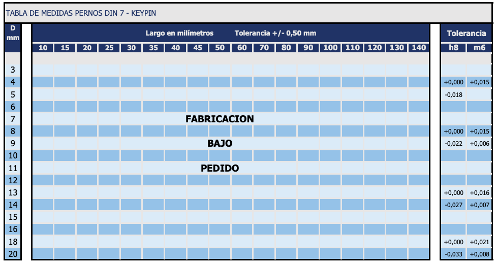 se fabrican con tolerancias «m6» es decir sobre medida, éstos son utilizados cuando se requiere una segura y fácil manera de montar y desmontar partes mecánicas. Para donde es necesario un desplazamiento, se recomiendan los pernos en h8 o sea bajo medida.